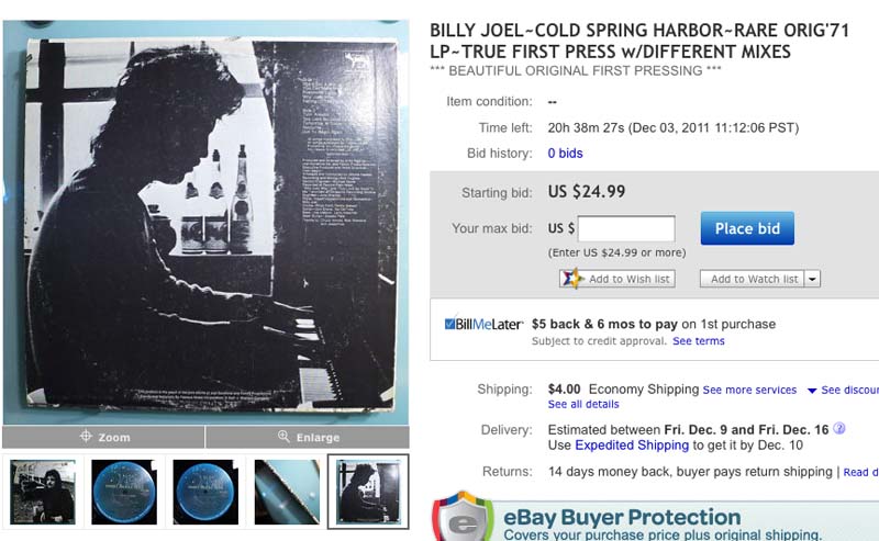 According to Wikipedia, there was an error in the mastering process which caused the album's speed to increase by a half a step, causing Billy's vocal to sound higher than usual. That 1971 pressing is now a collector's item. Here's a picture of then 22-year old Billy Joel from the back of that album, maybe thinking about sailing later that day at Cold Spring Harbor.