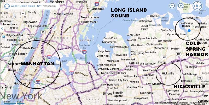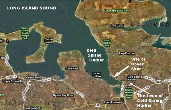 That didn't exactly look like Billy's dock. So I called the town historian, Robert Hughes, who was extremely helpful. Robert happened to be on the Board of the Eagle Dock Beach Association, and helped me visualize how the strange black-and-white shapes behind Billy were actually a dock extending into water. He was also able to set me straight as to the exact position of the former dock. .But first let me backtrack to show you where this all takes place. Here's a map of the New York City area showing the location of Cold Spring Harbor. It's about 30 miles east of Manhattan. Billy grew up in Hicksville, about 11 miles south of Cold Spring Harbor.