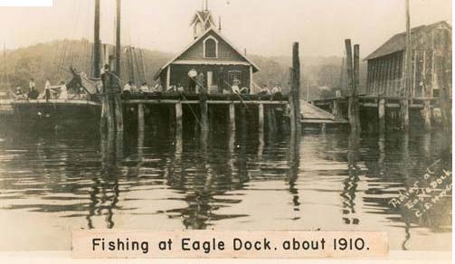 They told me the photo was taken next to a dock off of a private beach in town called Eagle Rock Beach, but that the dock didn't exist anymore. They also suggested I contact the historian for the Town of Huntington (which includes Cold Spring Harbor) who might know where I could get a photograph of it. So I looked up Eagle Dock on Google Images and found this old photo from 1910.