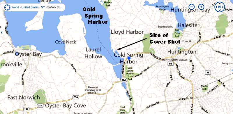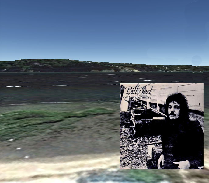 The view of the land in the horizon behind Billy comes from this picture (below), taken from Google Street Views, about 1/10 a mile south of where the dock would have been. In this photo we are looking west over Cold Spring Harbor at Laurel Hollow, a town just east of Oyster Bay that was referenced in Billy's song "Billy the Kid"; "From a town known as Oyster Bay, Long Island,