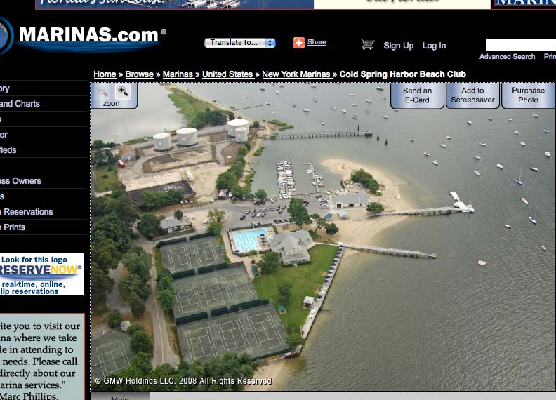 Now, Robert Hughes, the own town historical told me that that Eagle Dock has been on the same spit of land as the Cold Spring Harbor Beach Club which had a pool and a large central clubhouse. . So I typed in "cold spring harbor beach club" and came up with this picture on a site called Marinas.com. The club and pool are near the center.If you want to buy beautiful pictures of over 25,000 local marinas, check out that site. With another call to Robert, I now found that the three large water tanks in the back had been removed, but that the Eagle Dock used to be right next to them. It was at the end of a road behind the tanks And it began where the grass is in the water to their right. So now that I knew where the Cold Spring Harbor Beach Club was, I could zoom into find where the "Billy Joel" dock had been at the road at the edge of the property..