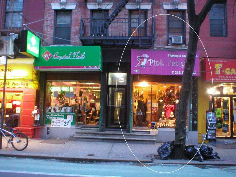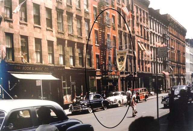The Folklore Center was a major gathering place for folkies like Van Ronk. It sold books, record, and instruments, and even was a place where folksingers, notoriously always crashing at other peoples apartments, could have their mail sent. Bob Dylan would often come and type up songs in the back room. The present Day Folklore Center, circled. The old steps have been removed.
