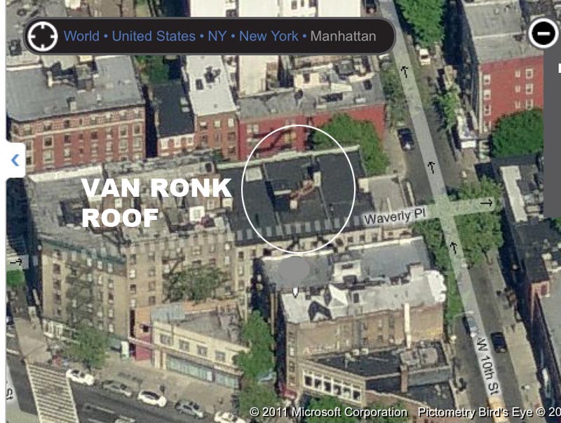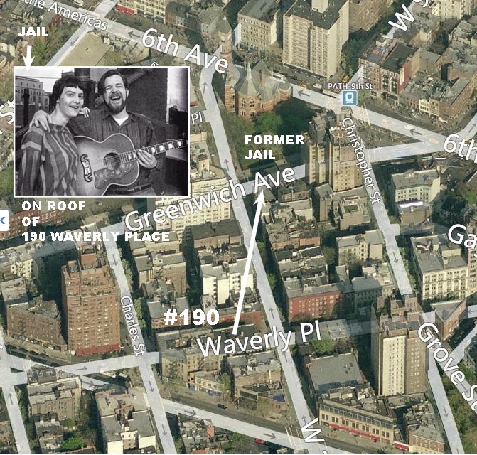 Here's how I found the address. Many books stated that Dylan crashed at the Van Ronk's on 15th Street, but none mentioned the address. So I went to the New York Public Library on 42nd Street and looked at their "reverse phone book" on microfilm (this type of phone book is by street, then building, then by who lives in each apartment). I found the microfilm for the 1961 Manhattan phone book, looked at West 15th Street (since Greenwich Village is on the west part of the island) and scanned all the names until I came to Dave's girlfriend (later wife) - Terry Thal. In 1961 Dave and Terry moved to an apartment in this building at 190 Wavery Place between West 10th Street and Charles Street.