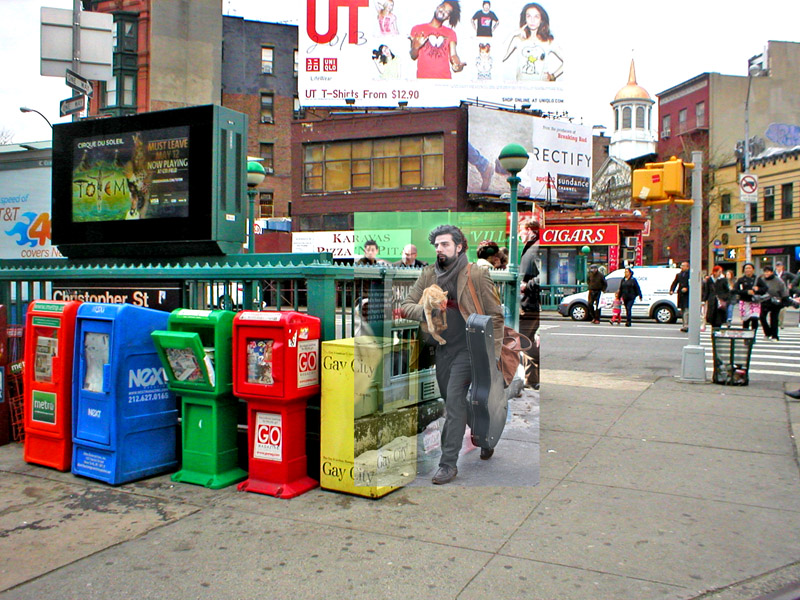 Here's the album PopSpotted. In the background of both pictures you can see a small tower on a residential building bordering on the west side of Washington Square Park.