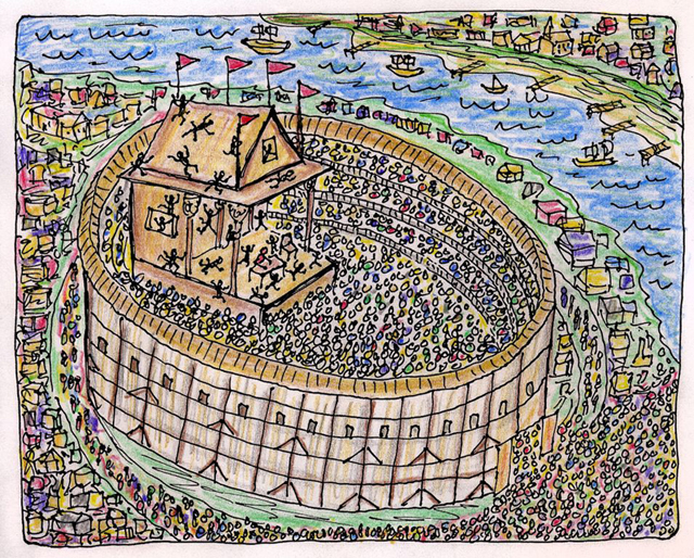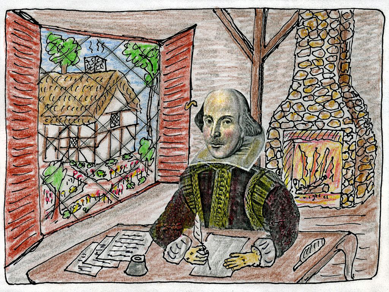 He would sit at his window and look out at the beautiful gardens, have a spot of tea, and think of things he would like to write about. Things like comedy, tragedy, and history. Things like witches and kings and people doing good and bad things. Things that people liked to gossip about. Things that made them laugh. Things that sometimes made them cry. And things that sometimes scared them. Shakespeare also spent one whole day in Stratford-upon-Avon going from quaint store to quaint store looking for a quill pen that felt "just right" to write with. The pen he found was made from a beautiful feather and had a sharp point that, when dipped in ink, wrote beautiful flowing letters, just the way he liked them. And then he went home and took a nap. (End of Act Two) (9) Finally, the day of the big event arrived. People came to the Globe Theater from miles around London to watch the contest. The Globe held 3,000 people, but at least 10,000 came, so the rest of them milled around outside the doughnut-shaped theater waiting to hear news about the writing match.