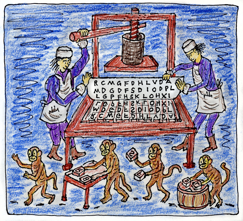 Scenes from the book: Four of the Million Monkeys randomly enter type into a Gutenberg Printing Press with the help of two printers during the contest with Shakespeare.