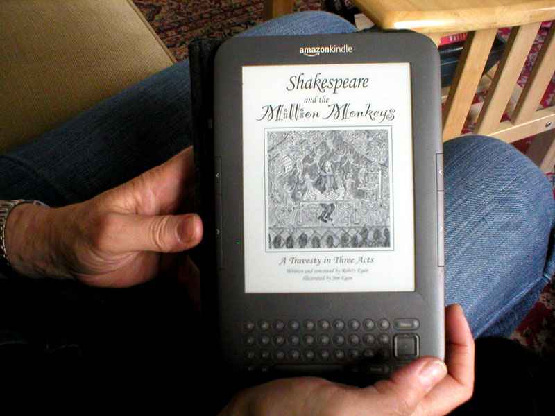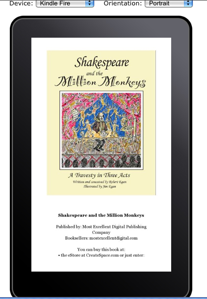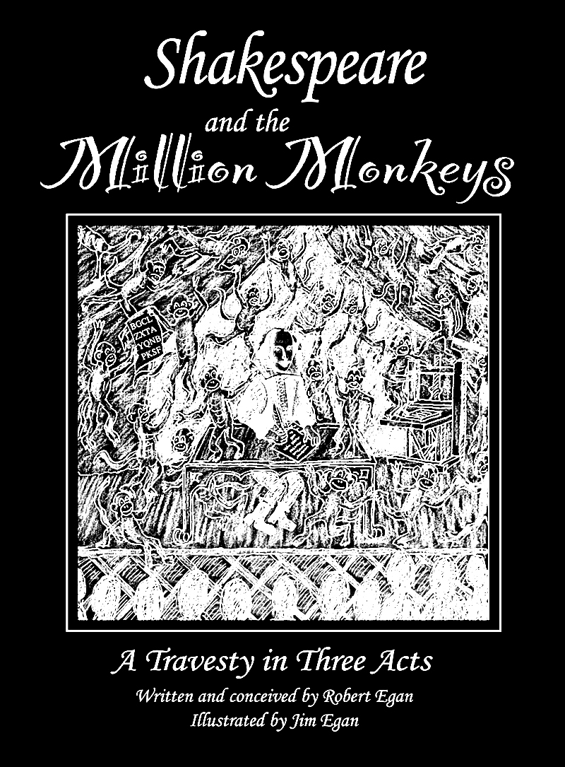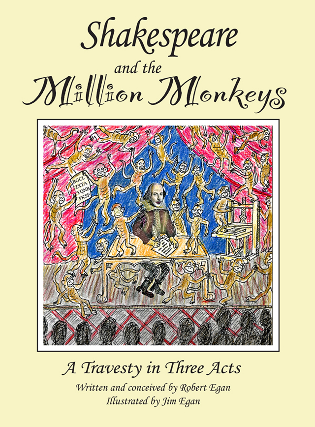 Shakespeare and the Million Monkeys - by Robert Egan - Illustrated by Jim Egan Pull up a comfy chair and click below to see Louise Egan's lively reading of the entire book. The video also includes all the illusrations. Note: The paperback book is temporarily sold out, but we are working to get it back into print with a print-on-demand company. If you are a publisher who would like to publish the book, send us an email. In the meantime, the entire book is available online below for your enjoyment. GET THEE TO A FUNNERY! SCROLL DOWN TO READ THE ENTIRE 16-PAGE BOOK FOR FREE! It's a fun and thought-provoking story everyone in the family can enjoy, featuring Queen Elizabeth, Shakespeare, the Globe Theater, Hampton Court, Stratford-upon-Avon, Gutenberg's Printing Press and a Million wild and crazy Monkeys. Hey, Shakespeare! Watch out for those banana peels!