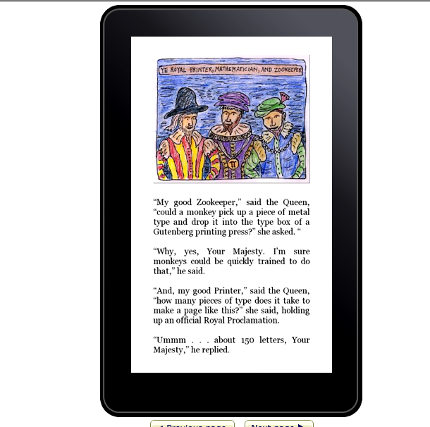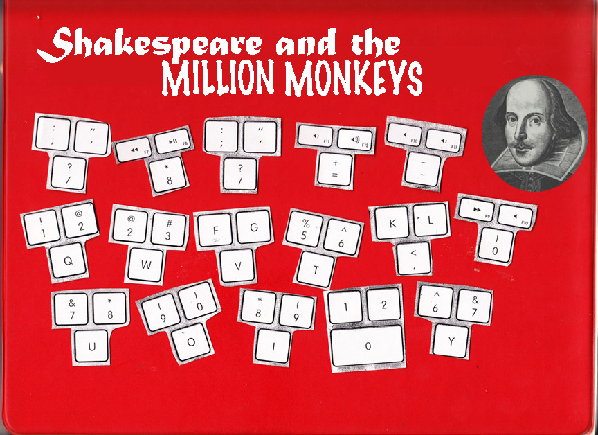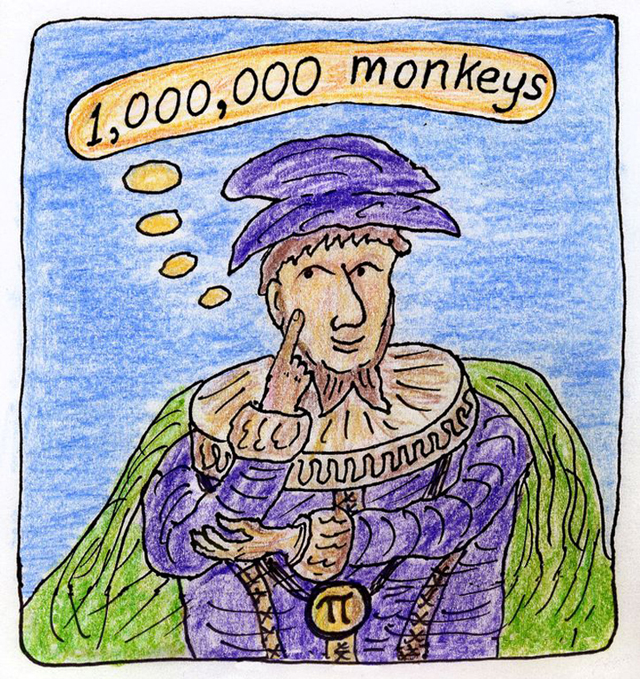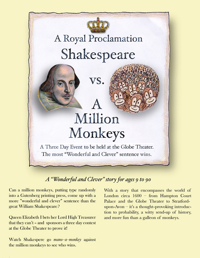 "My good Zookeeper," said the Queen, "could a monkey pick up a piece of metal type and drop it into the type box of a Gutenberg printing press?" she asked. (3) "Why, yes, Your Majesty. I'm sure monkeys could be quickly trained to do that," he said. "And, my good Printer," said the Queen, Òhow many pieces of type does it take to make a page like this?" she said, holding up an official Royal Proclamation. "Ummm . . . about 150 letters, Your Majesty," he replied. "And, my good Mathematician," said the Queen, "how many monkeys, putting type randomly into a type box, would it take until one of those pages produced a sentence as wonderful and clever as one of those of Mister William Shakespeare? The Royal Mathematician had never been asked a question so challenging before. Quickly he scribbled some numbers. And, as he did, he murmured to himself, "Let's see, monkeys . . . times . . . letters . . . times . . . pages . . . minus . . . monkeys goofing off . . . equals . . ." "I have it!" he exclaimed. "How many?" said the Queen. "One million monkeys!" said the Royal Mathematician.