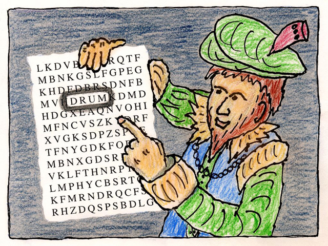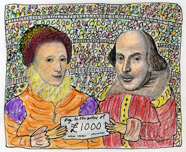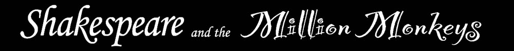 He pulled off the top sheet and, as he gave it to the Baron, he said, "Unfortunately, of all the pages of type the monkeys made, Sir, the judges could only make out one word longer than three letters. Specifically . . . the word "drum."" "Drum?" said the Baron, clearly agitated. "A million monkeys can only come up with the word "drum," and meanwhile Mister Shakespeare can write a whole play full of hundreds of "wonderful and clever" sentences like..." (16) The Baron opened the manuscript and read three random sentences out loud: "Double, double, toil and trouble; fire burn and caldron bubble." The Royal Zookeeper looked down at his feet and said sheepishly, "Well, perhaps we needed more monkeys." "I royally doubt it," the Queen piped in, clearly enjoying the way things were turning out. Then the Queen turned to Shakespeare, "Good job, Mister William Shakespeare of Stratford-upon-Avon. You win!" And, handing a check to Shakespeare, she added, "Here is the check for 1,000 pounds for the Globe Theater. Continue your outstanding work."