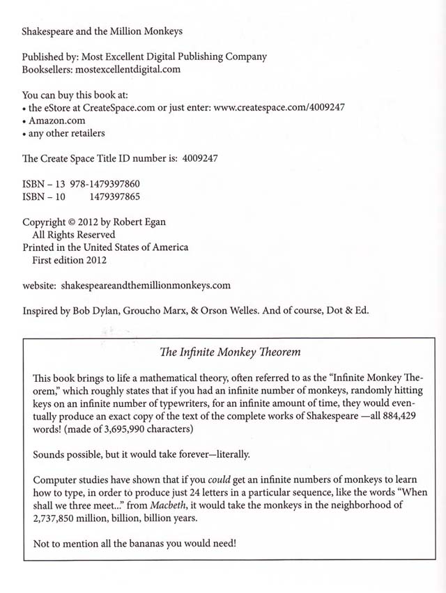 Suddenly, in walked the Queen's Lord High Treasurer and chief mucky-muck, Sir William Cecil, who was also known as Baron Burghley ("Burr-lee"). He was waving a piece of paper with numbers on it. "Your Majesty, if I may ask about a check," said the Baron. "It's a check for 1,000 pounds from you to the Globe Theater run by a Mister William Shakespeare. May I ask what this is about?" "It's about art and culture, my good Baron," said the Queen. "I want to support his theater. He writes such wonderful plays." (page 1) "But Your Majesty," said the Baron, "playwrights like this Mr. Shakespeare write about frivolous, made-up things. Stories about fools and wicked, evil royals. Shouldn't the money go to someone who writes books about things that are realÑthings like history and math and science? Shouldn't it go to the next Plato or Aristotle?" "There's more to life than philosophy books and accounting ledgers, my dear Baron," said the Queen. "Well," said the Baron, "my professional advice is that you should not be giving the good royal family money that you inherited from your father, King Henry the 8th, to a theatrical group." "But it's William Shakespeare's theater group, Cecil old boy," said the Queen. "He's the most famous playwright in all of England. His stories appeal to rich and poor alike." "Plays involve donkeys and fairies and ghosts and such," said the Baron. "And unlike great books, plays are like the wind. They amuse people for a few hours and then they go away, never to be seen or heard of again. On the other hand, books are forever. One hundred years from now no one will ever have heard of this playwright, William Shakespeare." "But he's such a marvelous writer, Baron. He writes such wonderful and clever sentences like: "Parting is such, sweet sorrow," "Romeo, Schmomeo! I say!" said the Baron, "Why I'll bet that if I put a bunch of monkeys in a room for a week and threw in some pencils and paper, they would end up writing a sentence as good as one of those of your Mister William Shakespeare." "I will take that bet, Cecil old-boy," said the Queen. "You will?" said the Baron, hardly believing what he had heard. "With pleasure." said the Queen, "Besides, we could use a little excitement around the palace. Your royal bridge games are getting tiresome." (2) "As you wish, my Queen," said the Baron. "But where on earth are you going to get monkeys that can write with pencils?" "I can't," said the Queen. "But I can get the next best thing." The Baron looked puzzled. "Jester!" said the Queen loudly, "Bring me the Royal Mathematician, the Royal Printer, and the Royal Zookeeper. And make haste." "Haste makes waste, Your Majesty," said the Jester. "Shall I bring a wastebasket, too?" "You're too funny, Jester," said the Queen. "That's why I love having you around. But in this case, just do my bidding - before I have your head chopped off!" The Jester froze in his footsteps. "Just kidding!" said the Queen, looking around the court, "Boy! Everybody takes what I say SOOOO seriously. Lighten up, people!" The Royal Mathematician, The Royal Printer, and The Royal Zookeeper were quickly brought before the Queen.