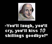 "Hazzzah!" shouted the crowd all together (mostly because the word "Hooray" hadn't been invented yet). The Queen allowed Shakespeare to kiss her hand goodbye. And, as he walked away, she said to him, "Write on, Mister Shakespeare! Write on!" (17) And so Queen Elizabeth gave the money to help support the Globe Theatre, and a rebuilt version of the theatre still exists today. You can even visit it if you go to Merry Old England. As a "thank you," the Queen was given Royal Box Seats, complete with Royal Refreshment Stand in the first balcony. And from there she could see 3,000 of her subjects enjoying Shakespeare's plays. And below her, on the floor of the theater, she could see the "groundlings," the poorer people who were only charged a penny to see the play (but had to stand up for the whole show). And even the Baron learned to love plays even the ones about naughty Kings, conniving Queens and skeptical Barons. And the million monkeys, who didn't actually know what they had been doing in England, but had enjoyed swinging from the chandeliers in the Queen's palace, were taken back to their homes around the world by the British Royal Navy, whose sailors were VERY happy when the last monkey left the last boat.