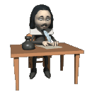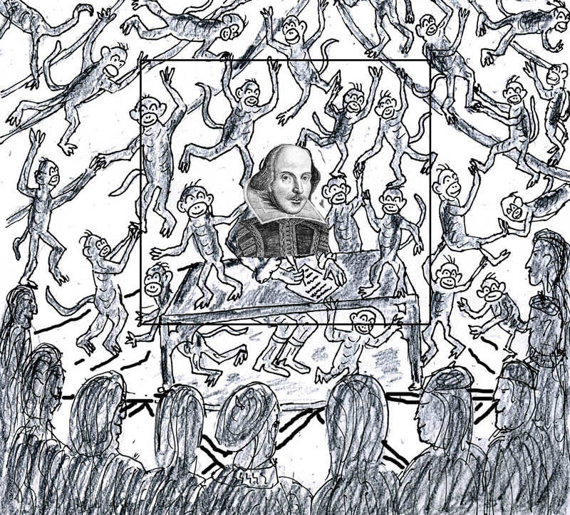 And why not? The odds seemed to favor the monkeys. After all, there were a million monkeys and only one Shakespeare. From then on, all the pages were brought into the back room where they were inspected by the judges in secret. And each time the printers pulled out a freshly printed page, the crowd "OOOOHed" and "AHHHHed" as they fought each other for a glimpse of a page that might contain a most "wonderful and clever" sentence. (13) Meanwhile, Shakespeare wrote away with his new quill pen, usually deep in thought, sometimes laughing to himself, sometimes shooing off the odd monkey that jumped on his back or flung pieces of banana at him. "Well, that's show business," Shakespeare thought to himself, "If it will help me raise money for the theater, it's worth it." He also enjoyed looking out the entrance of the Globe at the vast crowd outside. "Good advertising for my theater, too," he thought.