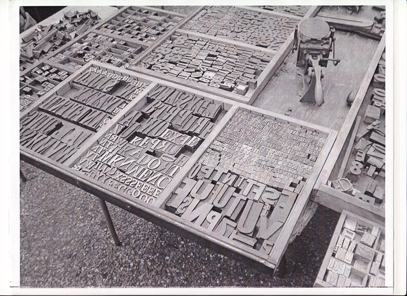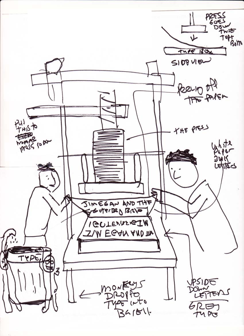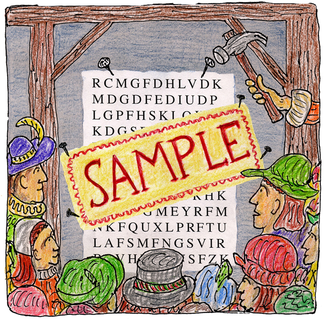 Meanwhile, the Royal Printer and his assistants quickly straightened out the letters in the type box, smeared ink onto the type, and inserted the paper into the press. They pulled the handle to press the ink onto the paper, and the result was a proclamation-sized page full of letters. (12) After they printed the first page, they nailed it up on the wall for all to see. But they covered most of the letters with a cloth that said "SAMPLE" in case the monkeys had already written something "wonderful and clever." And even though the letters that the people could see, spelled only gobbledygook - crazy words like RCMGFD or LPRFTU - they still thought that behind the cloth might be a beautiful sentence that would win the contest.