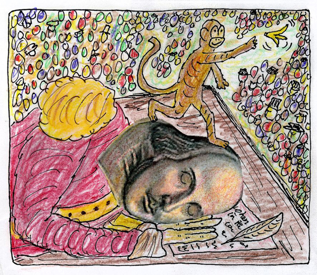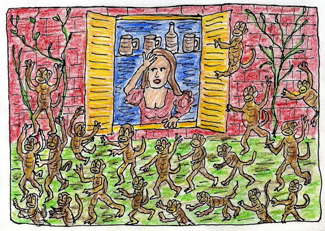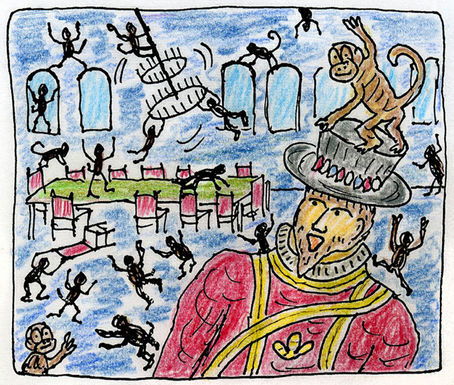(7) Soon the first monkeys arrived at the Palace. "Oh, my!" said the Royal Butler to the staff. "WE HAVE GUESTS! LOTS OF GUESTS!" And for the next two weeks the million monkeys had a grand time at the Queen's palace, courtesy of the Queen. They were swinging from the chandeliers, raiding the Royal Food Cabinet, pretending to have tea, jumping on the Yeoman Guards' big black hats, diving off the towers into the moats, playing tag in the dungeons, and causing all sorts of monkey mischief.