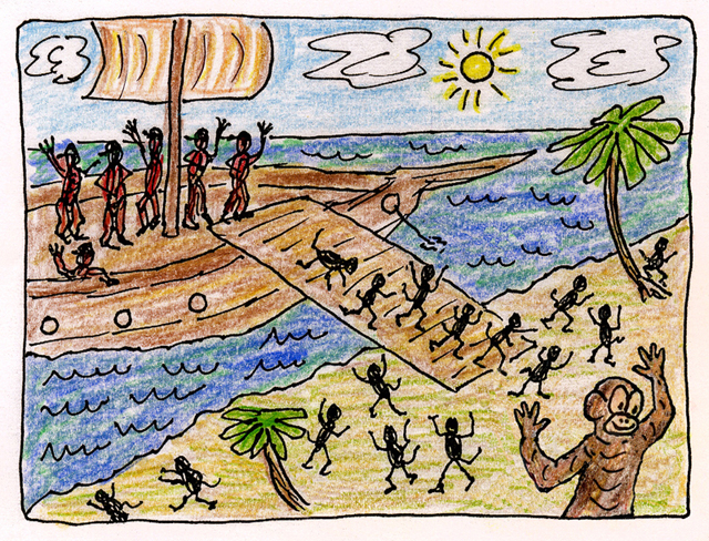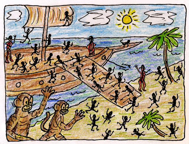 "Then one million monkeys it shall be," said the Queen. (4) She turned now to the Baron and said, "We shall have a Royal Contest to see who can write the most "wonderful and clever" sentence: Your one million monkeys or my Mister William Shakespeare." "Printer, take these words down and print up the following proclamation," said the Queen. "Shakespeare versus A Million Monkeys. "And have them post the proclamations all over London and for miles around," continued the Queen. Then, addressing the court, she said, "The contest will start in one month's time. If Mister Shakespeare wins, I will donate 1,000 pounds to his beloved Globe Theater. And, if the monkeys win, the good Baron can take the money and find a scholar to write a book about war or other things important to the good Baron." Then the Queen said, "Fetch me the chief of the Royal Navy!" The chief of the Royal Navy was soon fetched. "Lord High Admiral, you have one month. I want you to use every ship in the whole Navy," she said. "Yes, Your Majesty. Er . . . What for, Your Majesty?" he said. To bring me a million monkeys!" The Queen said, smiling to herself. "The contest . . . is on!" (End of Act One) (5) And so the Royal Word went out to all the corners of the earth (even though it was round) that the Queen wanted a million monkeys, with no expense to be spared, free passage to and from England, courtesy of the Royal Navy. And soon British ships of all shapes and sizes began delivering monkeys to the docks of London.