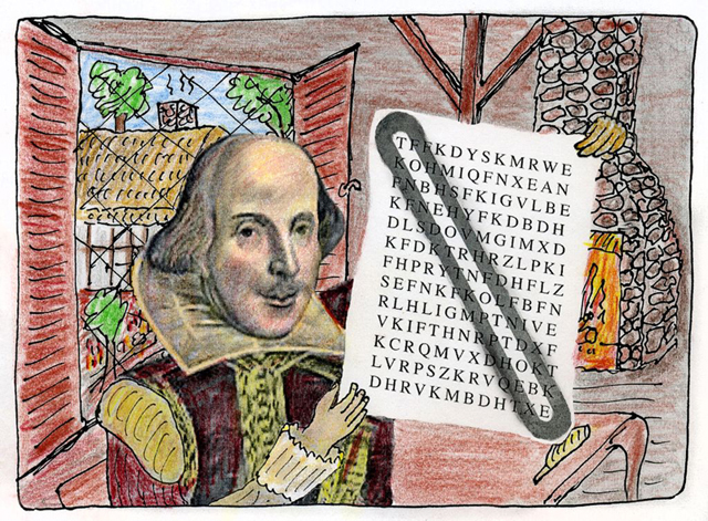 (18) As for Shakespeare, he returned home to Stratford-upon-Avon a hero. And, as a souvenir of the event, he took with him one of the monkeys' printed pages. And, by chance, while looking at the random assortment of letters on the page, he happened to see, in a diagonal row, the letters T-O-B-E-O-R-N-O-T-T-O-B-E, and said to himself, "Hmmmm . . . TO BE OR NOT TO BE Ñ why that is a good question! Maybe I'll use it in my next play."