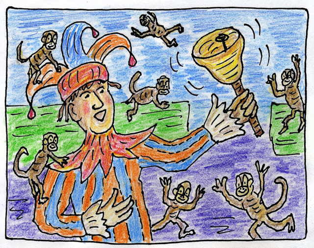 "Competitors, start your sentences!" the Jester said, as he clanged a big hand-bell several times, so that even the audience outside the theater would know the competition had begun. (11) And with that, Shakespeare got down to writing. He stroked his chin. He tapped his fingers. He looked intently into the sky for inspiration. And then, when he finally put ink to paper, the crowd let out a collective "GASP!" because they knew a master was at work. Meanwhile, on the other side of the stage, it was a total zoo. A line of monkeys stretched from the stage, out the theater entrance, and all the way back across the River Thames to Hyde Park, where all the monkeys had been gathered. They were eating bananas and causing mischief and doing all those things that monkeys do when they are far away from home. Then, one by one, the monkeys were led onto the stage where the Royal Zookeeper showed them how to reach into the barrel of type, grab several letters, and then drop them randomly into the type box of the printing press.